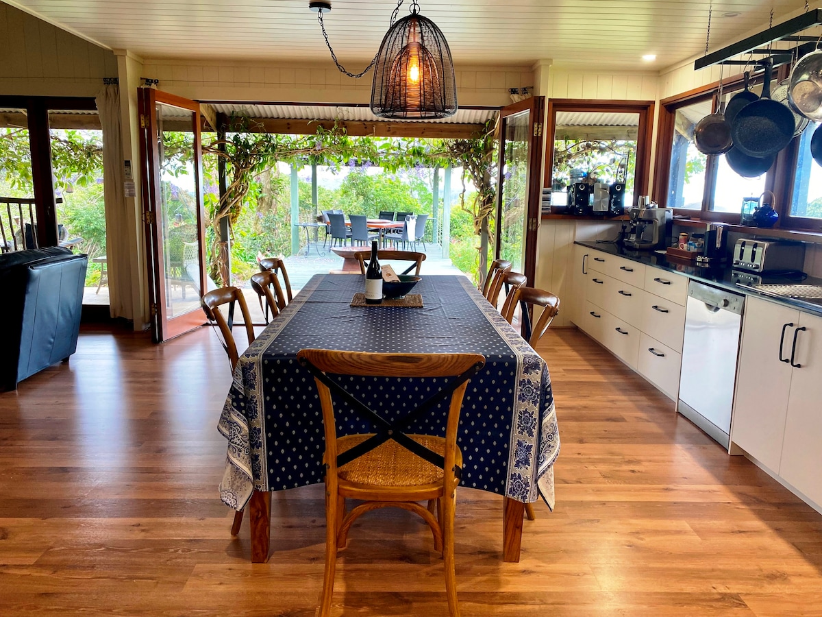 SALIDA TARDÍA A las 5:00 P. M. LOS DOMINGOS En el exuberante Sunshine Coast Hinterland, esta propiedad tiene un montón de carácter. Aire acondicionado, fuego de leña, chimenea, camas de calidad hotelera y ropa de cama ... cocina gourmet. Un cenador gastronómico tiene vistas a 1 acre de hermosos jardines y vistas de la costa. Privacidad absoluta, cancha de petanca y muchos lugares secretos por descubrir. A 90 minutos de Brisbane, a 8 minutos de Montville.