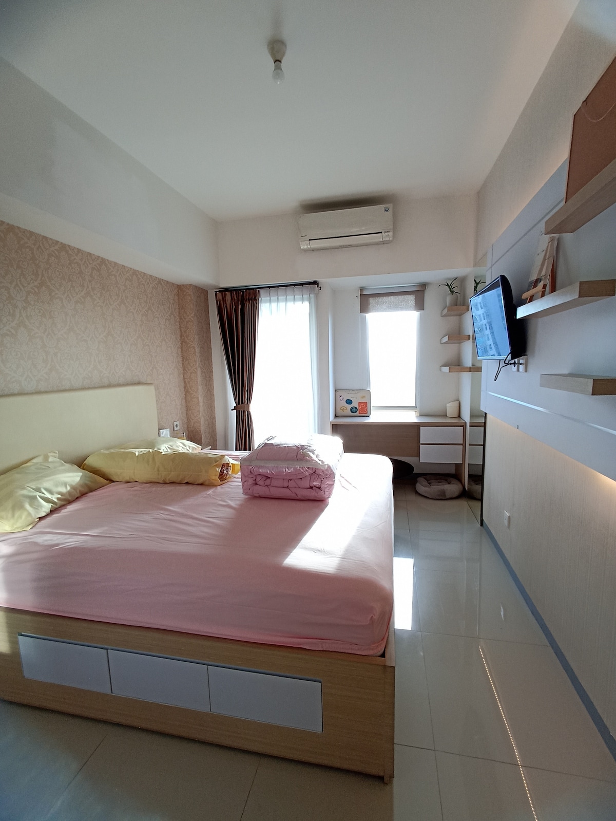 Apartamento estudio en Pakuwon Mall con una decoración acogedora y moderna. - Conectado con un centro comercial (Pakuwon Mall, el centro comercial más grande de Surabaya), restaurante, supermercado/comestibles, tienda de marca, cine, parque infantil, karaoke, foodcourt, etc. - Wifi de acceso completo, TV inteligente, Netflix (con tu propia cuenta) - Estufa eléctrica/de inducción, equipo de cocina, mini arrocera, hervidor eléctrico y vajilla.