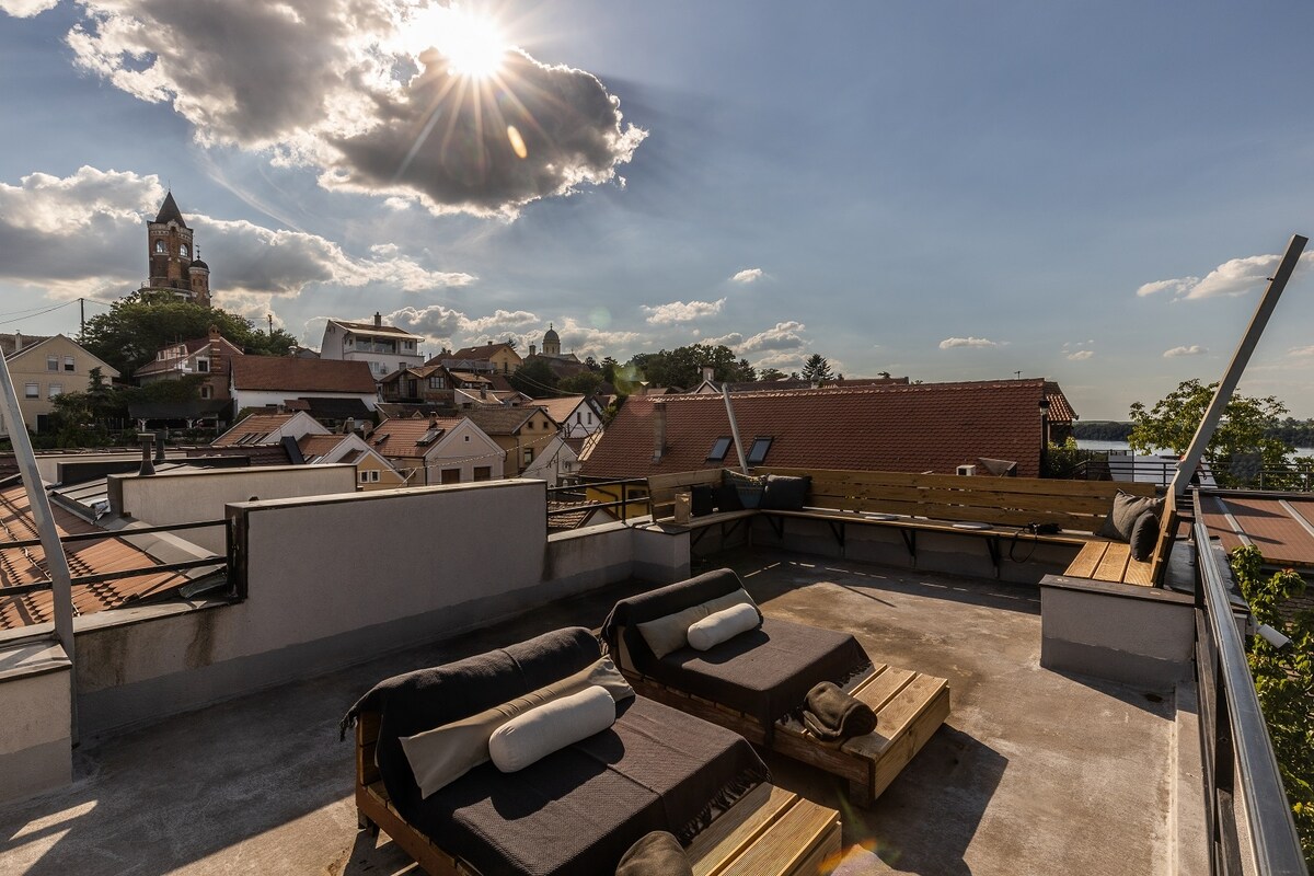 Este alojamiento único tiene personalidad propia. Amplia residencia de 3 dormitorios, tiene un increíble patio con vistas al río Danubio, que está conectado a la piscina cubierta y la zona de sauna, con una cómoda zona de descanso para proyecciones.