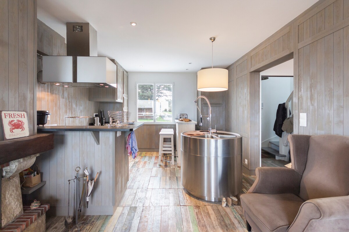 Casa reciente, clasificada con 3 estrellas turísticas, acceso rápido al mar (3 mm a pie) muy luminosa orientada más al sur con 3 terrazas amuebladas (comida, aperitivo y solárium con su jacuzzi adicional 30,00 € por noche) y gran sala de estar con su cocina abierta. Terreno cerrado que puede recibir a su mascota. las camas estarán hechas a su llegada y se le proporcionará una toalla. En invierno se proporciona leña para la estufa.