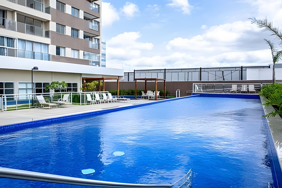 Lujoso apartamento con vistas panorámicas y acceso directo a DF Plaza Shopping. El dormitorio tiene una cama tamaño queen, una sala de estar con un televisor inteligente de 55 pulgadas y una cocina totalmente equipada y un baño. Ubicación privilegiada: restaurantes, supermercados y metro cerca. El condominio cuenta con piscina infinita, gimnasio, espacio de trabajo y mucho más. Wifi rápido, estacionamiento privado y seguridad las 24 horas. Es ideal para parejas, profesionales y turistas exigentes. Entorno tranquilo. Experimenta lo mejor con sofisticación.