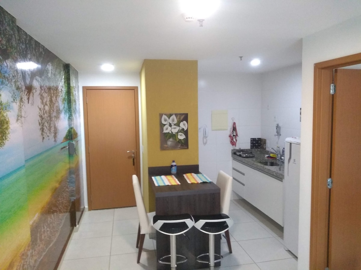Lleva a toda la familia a un condominio tipo club, con mucho espacio para divertirse en las piscinas climatizadas y cubiertas y en la piscina de la playa. Tenemos un espacio de garaje cubierto. Apartamento con 2 dormitorios, uno de los cuales es un baño privado con aire acondicionado, y otro baño social. Hay dos camas dobles y una sala de estar con una cama nido y cortinas opacas. Pueden dejar sus maletas y esperar en la sala de espera o usar el área común antes del check-in. Barrio: Águas Claras, una nueva ciudad segura con muchas opciones de restaurantes