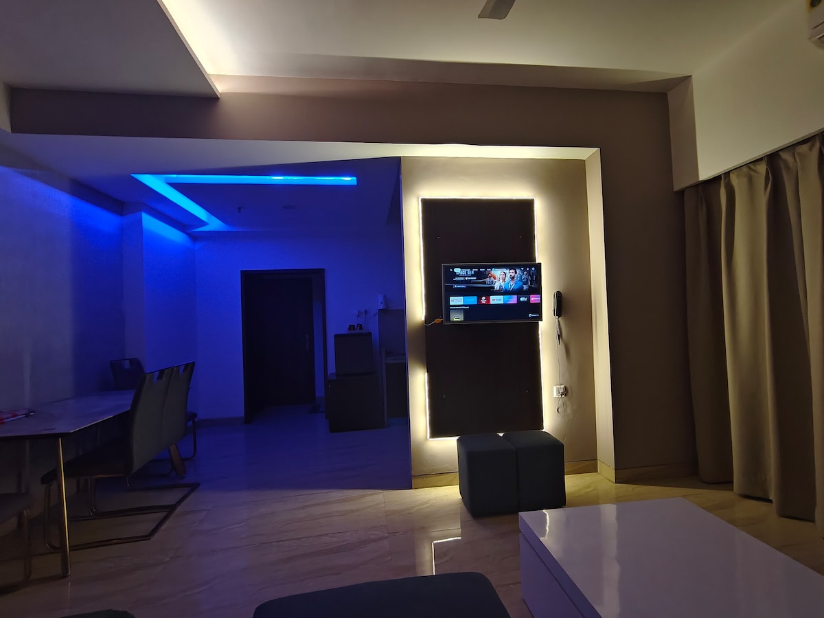 Vrindavan's Stunning Luxurious Suite - tasteful colors, corners & more 📍 Prime Location: ✔ Prem Mandir – 3 km (10 min) ✔ ISKCON Temple – 3.5 km (12 min) ✔ Banke Bihari Temple – 4 km (15 min) ✨ Why Stay Here? ✔ Luxurious box-style bed for ultimate comfort ✔ Inspired by Rajasthan’s folklore & vibrant culture ✔ 24x7 Lift | High-Speed WiFi | Fully Stocked Amenities Discover a unique blend of urban luxury and Indian heritage in this 11th-floor designer suite with breathtaking views. Welcome Home!
