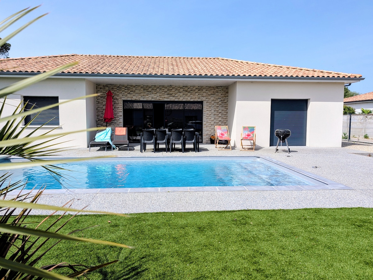 Casa nueva de 90 m2, 8 camas arriba, 1 baño en la planta baja y 1 cuarto de baño en el dormitorio principal, 2 aseos TV+WI-fi+Netflix, cafetera de grano A 20 minutos de Burdeos, estadio Matmut, vinexpo y a 45 minutos de las playas y en la carretera de los castillos del Médoc En medio de los viñedos en 1 hectárea de jardín Barbacoa tradicional + plancha y piscina 10x5 m compartida con los propietarios si están presentes. El spa/jacuzzi estará reservado para usted. A 200 metros a pie del antiguo pueblo de Ludon-Médoc y de todos sus comercios