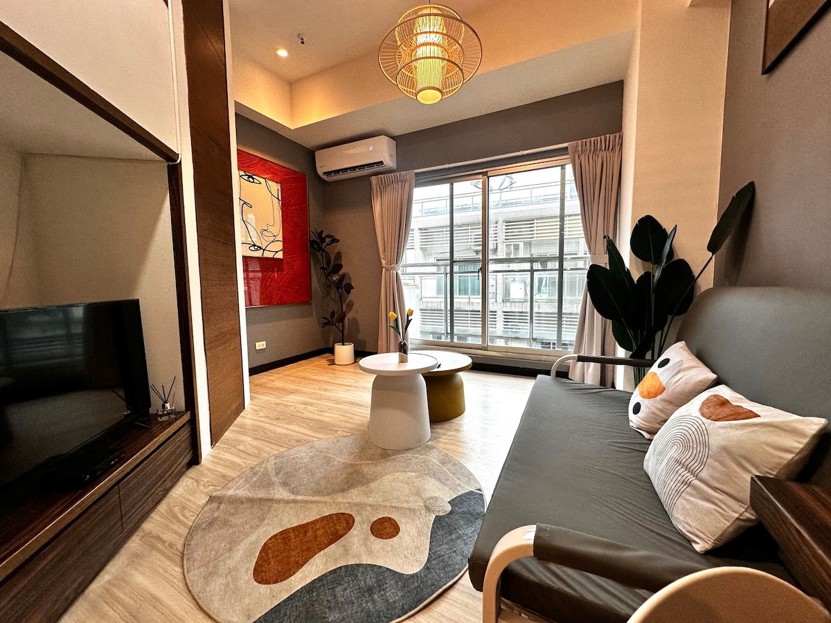 室內的灰白主色,配搭北美木紋銅色傢俱及家飾, 用心為您的居住空間提供沈靜優雅的感覺。日韓系電器的選用,不論是無線充電藍牙喇叭 ,大螢幕伸縮高清電視 ,都能滿足您對影音效果的要求。房源位於高樓內縮樓層,阻絕不必要的噪音並滿足您對景觀 ,安靜及隱私的要求。大樓並配有全天候警衛,住戶專屬電梯 ,公用大露台 ,以及地下收費停車場, 位處西門町核心路段,無論搭乘捷運或自駕都非常方便。El diseño interior basado en el tono de la tierra ofrece una atmósfera cálida, tranquila, curativa y encantadora. Instalaciones de la habitación, incluyendo cama doble, baño privado con ducha, aire acondicionado, televisor inteligente 4K con películas/Netflix, Internet WIFI, iluminación de la cala y reproductor de música con conexión inalámbrica y puertos de cargador USB.