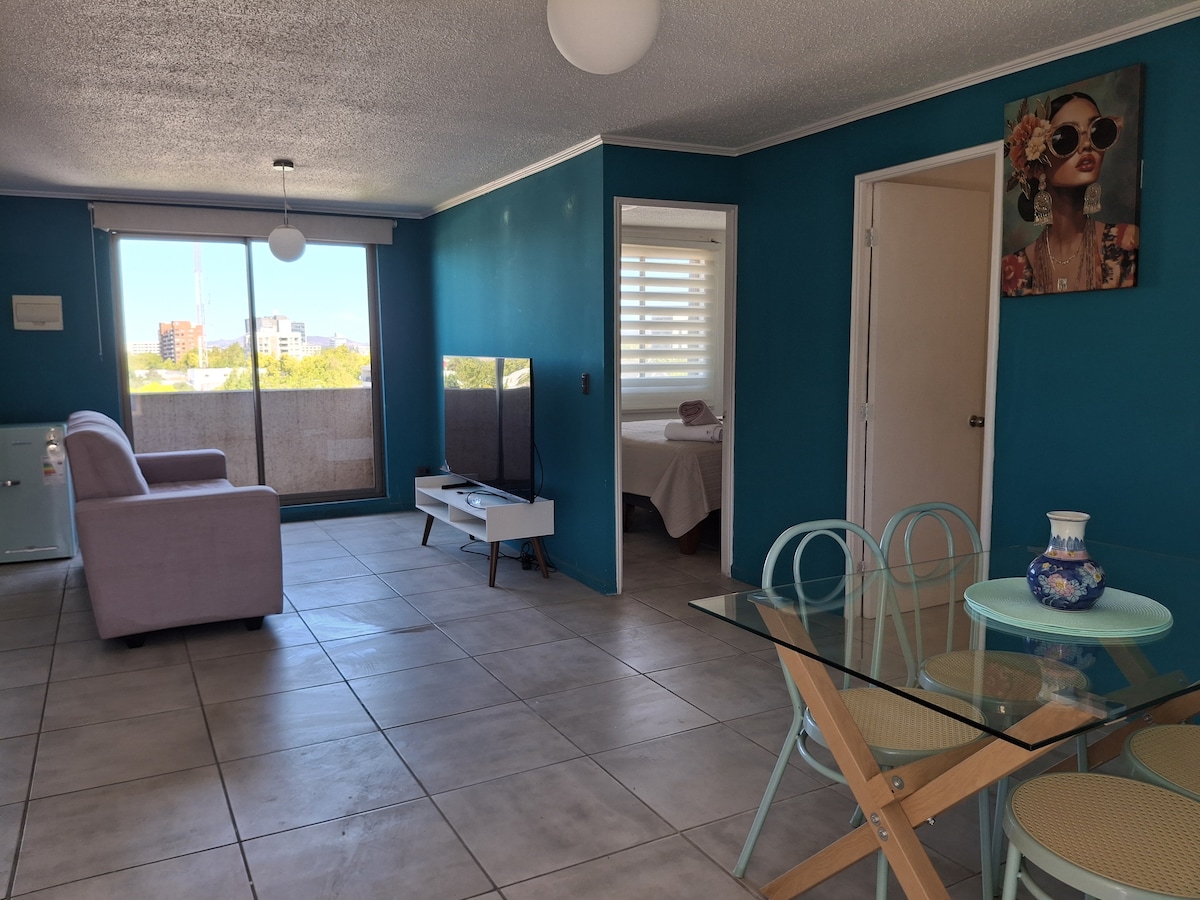 Moderno departamento ubicado en la Alameda de Talca, ideal para quienes buscan conectividad y comodidad. Cuenta con todo lo necesario para que tengas una grata estadía: 2 dormitorios con closets, ropa de cama y toallas de calidad; living comedor con aire acondicionado, balcón con hermosa vista y cocina; completamente equipado para 3 personas, además de ingreso autónomo. Ubicación privilegiada, a pasos de pubs y restaurantes, bancos, supermercados, Centros Comerciales, Teatro y Plaza de Armas.