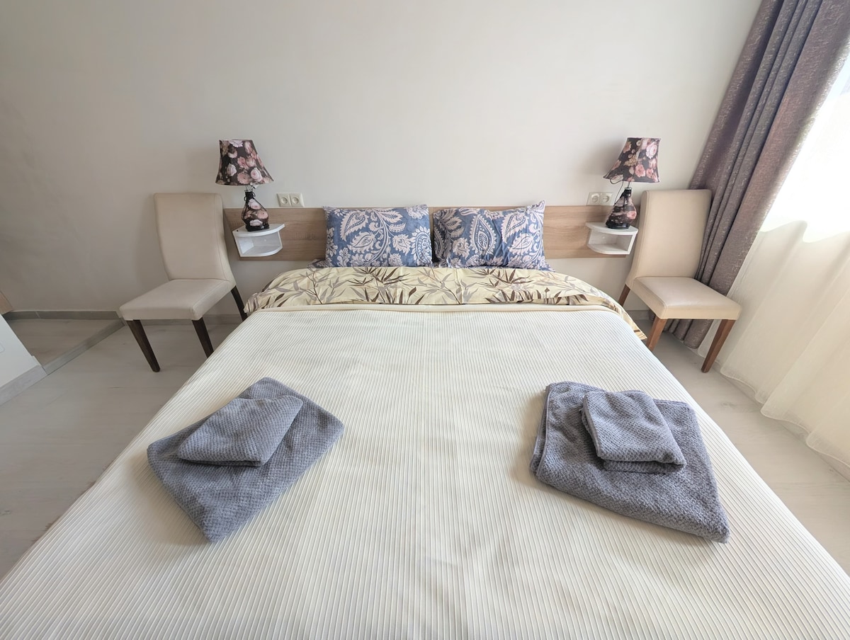 Un moderno y acogedor apartamento de dos habitaciones en la planta baja. Un dormitorio espacioso con una cama cómoda, una luminosa sala de estar con un sofá y una zona de trabajo, una cocina totalmente equipada donde puedes cocinar. El departamento cuenta con wifi, aire acondicionado, ropa de cama limpia, toallas y todo lo que necesitas para una estancia cómoda. El lugar es adecuado para familias, parejas e invitados que aprecian la paz y la comodidad.