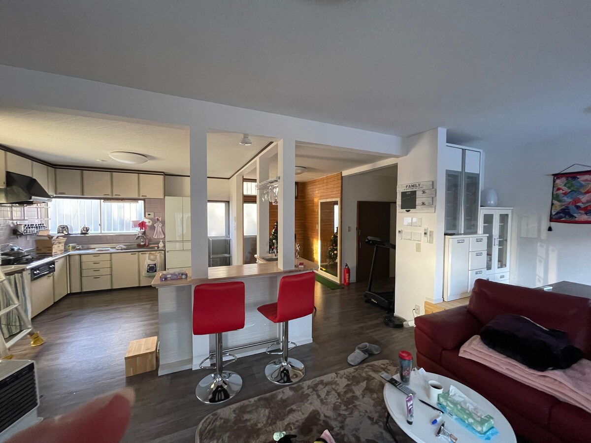 Proporcionamos el segundo piso ( 100 !) de una casa de dos familias. La familia anfitriona vive en el primer piso, pero el segundo piso es una casa completamente separada que entra desde las escaleras exteriores, por lo que se mantiene la privacidad. El dormitorio tiene 1 habitación con 6 alfombras de tatami habitación de estilo japonés del este (3 juegos de futones) + 6 alfombras de tatami habitación de estilo sur japonés, 2 camas individuales, 1 cama semidoble es una habitación pequeña, sala de estar y comedor. Introduje un colchón de baja elasticidad en una cama completa. (El nombre es True Sleeper)