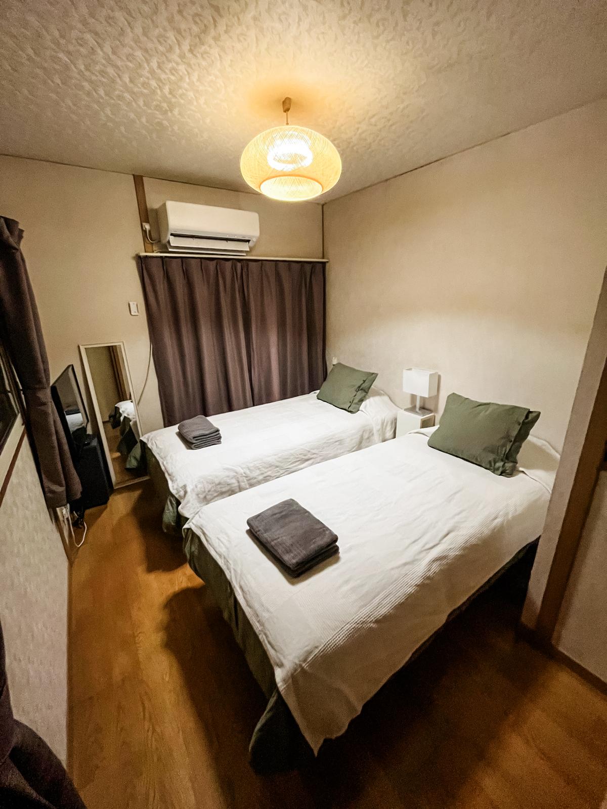 Una casa unifamiliar completamente nueva está disponible para alquilar. Todas las habitaciones están equipadas con un circulador y un humidificador de purificación de aire para prevenir infecciones, para que puedas pasar tu estancia con comodidad y tranquilidad. La cocina está equipada con nevera, microondas, tostadora, hervidor eléctrico, cafetera y varios otros utensilios de cocina y vajilla, lo que permite preparar tus propias comidas. También hay aparcamiento disponible, por lo que puedes utilizar tu propio coche o alquilar uno.