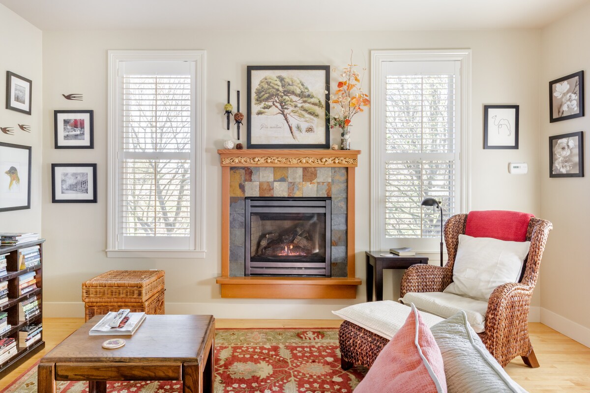 Escucha los pájaros y el arroyo de temporada. Rodeado de senderos para caminar y andar en bicicleta. Sumérgete en el jacuzzi, sauna, O Relájate en tu porche privado cubierto, llueva o truene, justo fuera de tu dormitorio con fogata de gas, sillas acogedoras con mantas, y bebe tu café o té, también proporcionado para ti. ¡Los smores son especiales! ¡Con todo lo necesario para asar! Recién remodelado en 2025 el dormitorio, pintura nueva, alfombra nueva. Cama doble nueva, enero de 2026 A 30 minutos de Pt. ¡Reyes, Monte Tamalpais y playas!