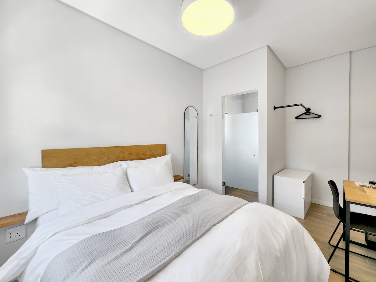 Our stylish double room in Cape Town city centre is designed with a minimalist and clean approach. The room is serviced daily and features are a comfortable double bed, a private ensuite bathroom with a refreshing hot shower, and a desk with high-speed internet ideal for remote working. Relax with Netflix on the Smart TV and enjoy the convenience of provided essentials like an iron, bathroom amenities and a hair dryer. Guests are also welcome to use our shared, fully equipped kitchen.