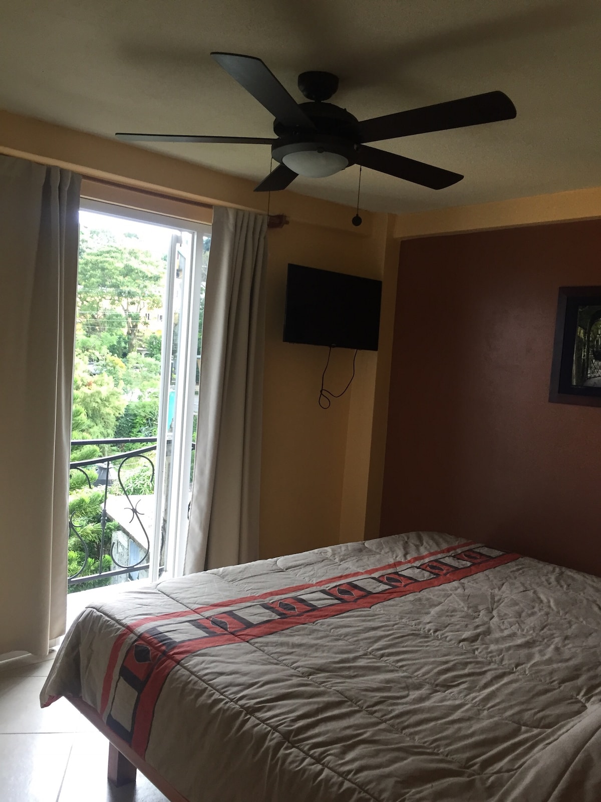 Es una estancia en planta alta con balcones en las habitaciones tiene buena vista hacia las montanas y muy buena iluminacion, las habitaciones tienen una cama king size, en total son 3 camas king size. su television, su ventilador. el departamento cuenta con su cocina integral,frigobar,parilla,cafetera,licuadora trastes para cocinar.Estamos por la carretera nacional y a 5 minutos en automóvil del jardin surrealista. **** no aceptamos mascotas.