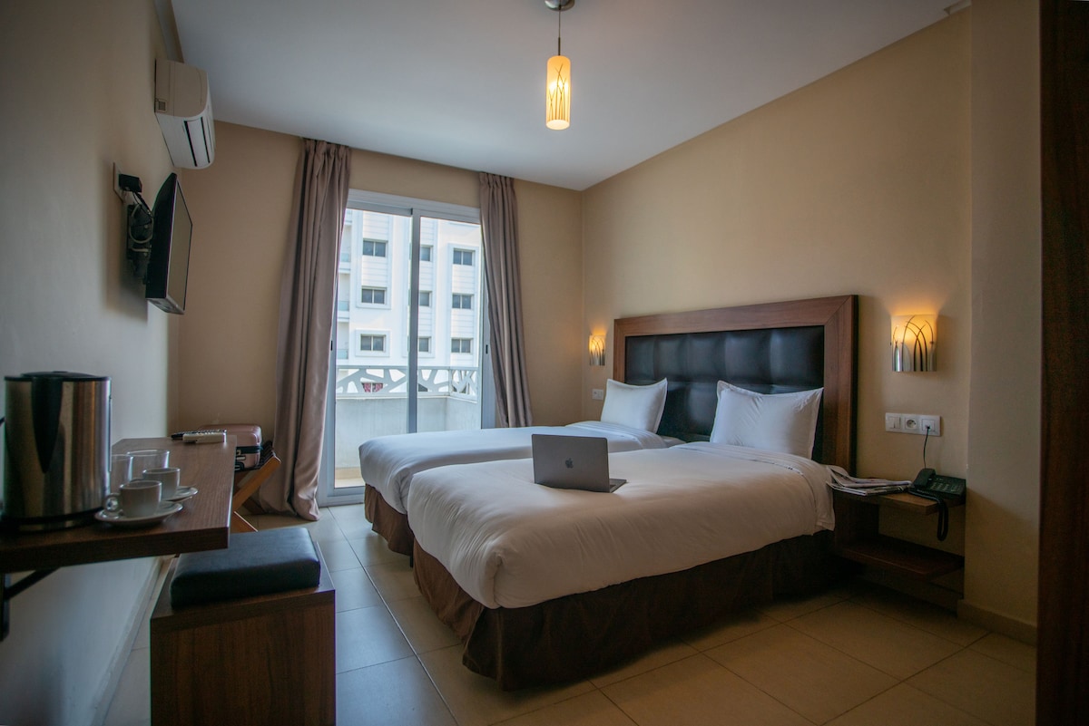 Bienvenido a nuestra suite con dos camas individuales en Villa Mirasol Hotel, ubicada en la playa de Malabata, Tánger. Esta elegante suite cuenta con dos cómodas camas individuales, un moderno baño privado e impresionantes vistas al mar desde la terraza compartida. Relájate con servicios de primera categoría, como TV y aire acondicionado. Disfruta de nuestra cafetería/restaurante interno, servicio de lavandería, traslados al aeropuerto y alquiler de autos. Explora la vibrante vida nocturna de Tánger, saborea la cocina local y visita atracciones como las cuevas de Hércules y Cap Spartel.