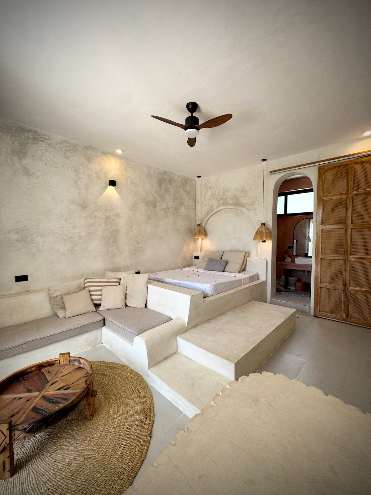 Planta baja de nueva construcción con generador de respaldo, ubicada en el jardín tropical de nuestra casa segura en una zona residencial en Jambiani. La casa de campo privada de estilo estudio consta de un área para dormir con baño privado, sala de estar, espacio de trabajo, cocina totalmente equipada y porche privado. Hay wifi y aire acondicionado disponibles. La propiedad está a un minuto a pie de la increíble playa de la costa este, que se extiende por una milla. Si quieres algún alimento específico antes de la llegada, esto se puede organizar fácilmente.
