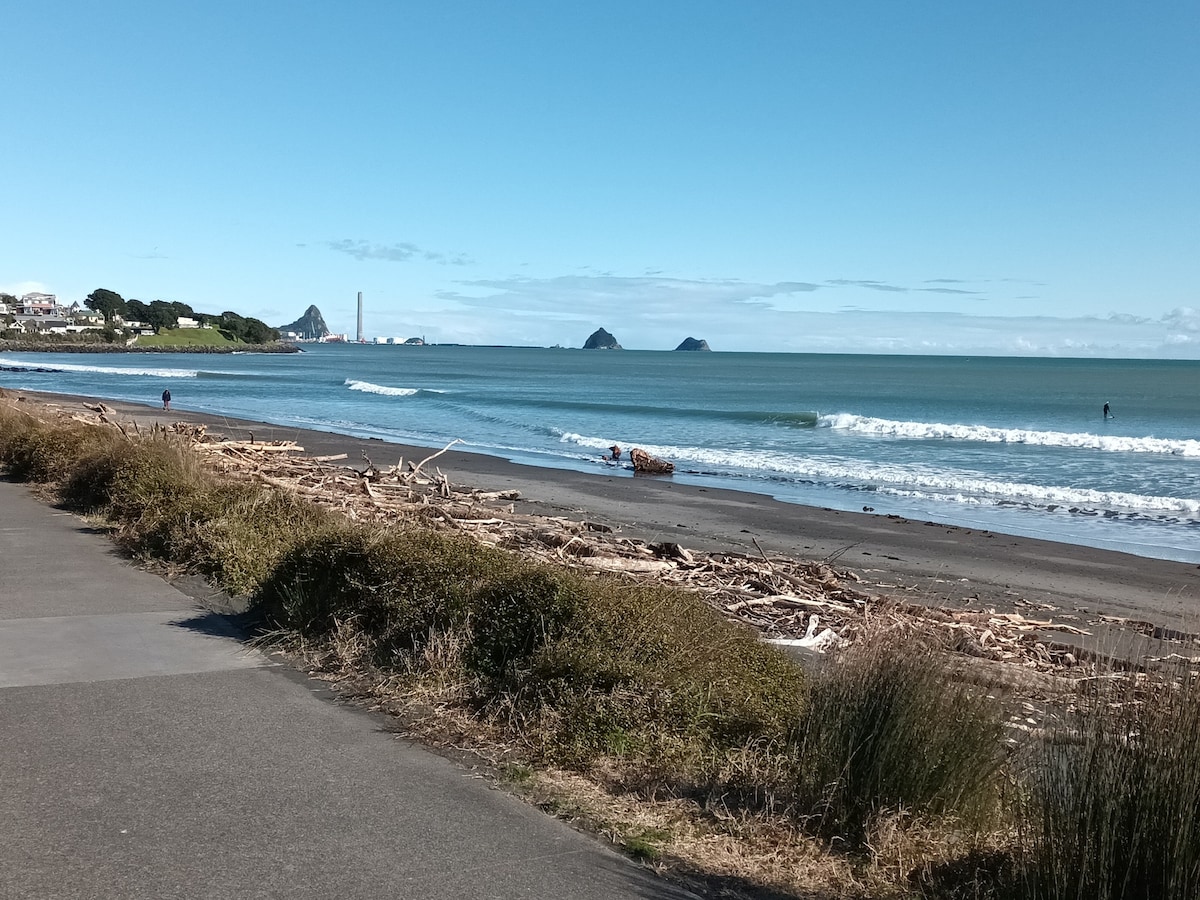 Vistas panorámicas al mar, a 1 minuto a pie de la playa, surf, kayak, senderismo por el monte Taranaki o en bicicleta por el sendero costero. A 3 minutos del parque infantil. Dormitorio principal con baño privado arriba. Cocina bien equipada con vitrocerámica de gas, horno, microondas, TV, Netflix y wifi gratuito. A 15-20 minutos de New Plymouth. A 10 minutos del aeropuerto. A 40 minutos de White Cliffs Walk, a 15 minutos del Festival de las Luces de Pukekura Park. A 35 minutos del monte Taranaki. Algunos reservan para 1 huésped y se presentan 6. Así que revisamos nuestra cámara de la puerta. Por favor, sé honesto.