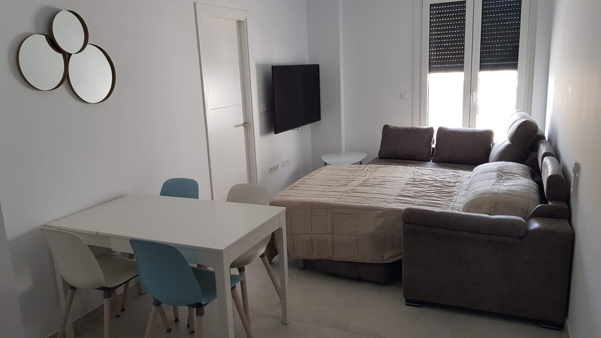 Edificio de nueva construcción finalizado en Junio 2019, dispone de garaje subterráneo y todas las facilidades para tu estancia. Situado a 250 metros del centro histórico un paseo de 4 minutos y ademas a 550 metros de la Playa (7 minutos), el apartamento tiene un cuarto (cama de matrimonio de 1,50x2,00) un baño con ducha y un Salón-Cocina (Sofá-cama de 1,35,x1,90) .