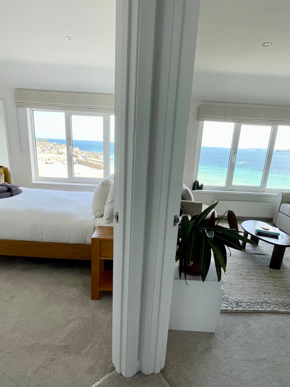 La amplia vista costera desde nuestro apartamento del centro de la ciudad es la misma que describe Virginia Woolf en su novela Al faro, inspirada en los veranos en St Ives: «hasta donde alcanzaba la vista, desvaneciéndose en suaves pliegues bajos, las dunas de arena verde, huyendo a algún país lunar». Tranquilamente escondido, el apartamento está idealmente situado para las vacaciones de verano e invierno, y el trabajo a distancia. El puerto está a dos minutos a pie, las playas de Porthmeor y Porthminster están a poca distancia a pie. Lo sentimos, no se admiten mascotas. No se puede fumar.