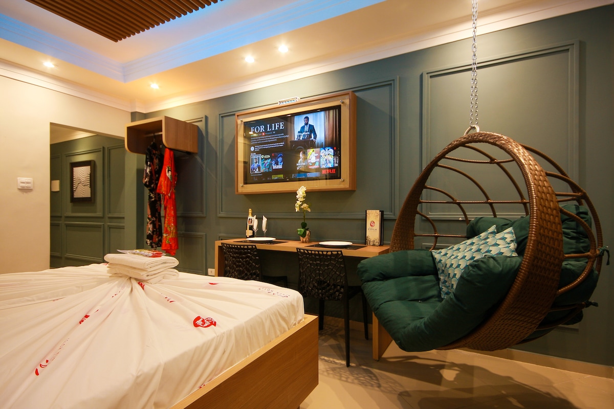 Tamaño de la habitación: 30 m². Esta habitación doble cuenta con una cama tamaño king, TV LCD de 49 pulgadas con Netflix, radio bluetooth, minibar, iluminación especial y aire acondicionado dividido Q/F. Incluye desayuno de cortesía.
