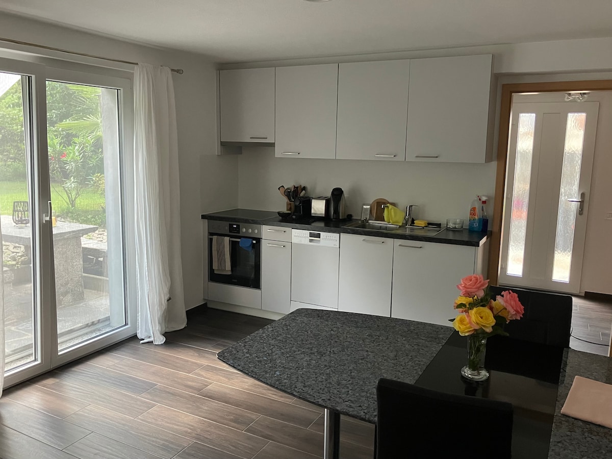 Apartamento moderno rodeado de naturaleza, ubicado en la PB de la residencia Buca10Home. Vista al campo de golf de Losone. A 3 km del centro de Locarno y Ascona. Cuenta con salón luminoso, cocina equipada, dormitorio, balcón y jardín privado. Ideal para tomar el sol , perfecto para comer al aire libre. Zona tranquila, rodeada de las montañas del Valle Maggia y las Centovalli. Bien conectado con transporte público, cerca de restaurantes y supermercados. Ideal para amantes de la naturaleza.