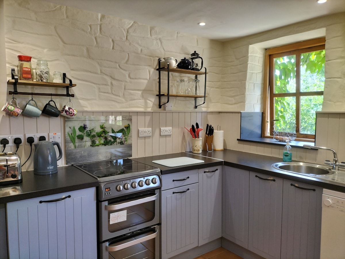Stabl Y Felin es un establo reconvertido de grado 2, unido a un molino de maíz patrimonial, que ha sido restaurado con mucho mimo utilizando habilidades tradicionales y materiales y muebles sostenibles. Con sus techos de 4,5 m, el establo viene con un dormitorio espacioso con cama tamaño king, baño privado con ducha a ras de suelo, sala de estar con cocina americana recuperada y barra de desayuno, y un pajar con un futón tamaño king escondido en la parte superior para los valientes. Una escapada tranquila y rústica al pueblo en las colinas, a 4 millas de la costa.