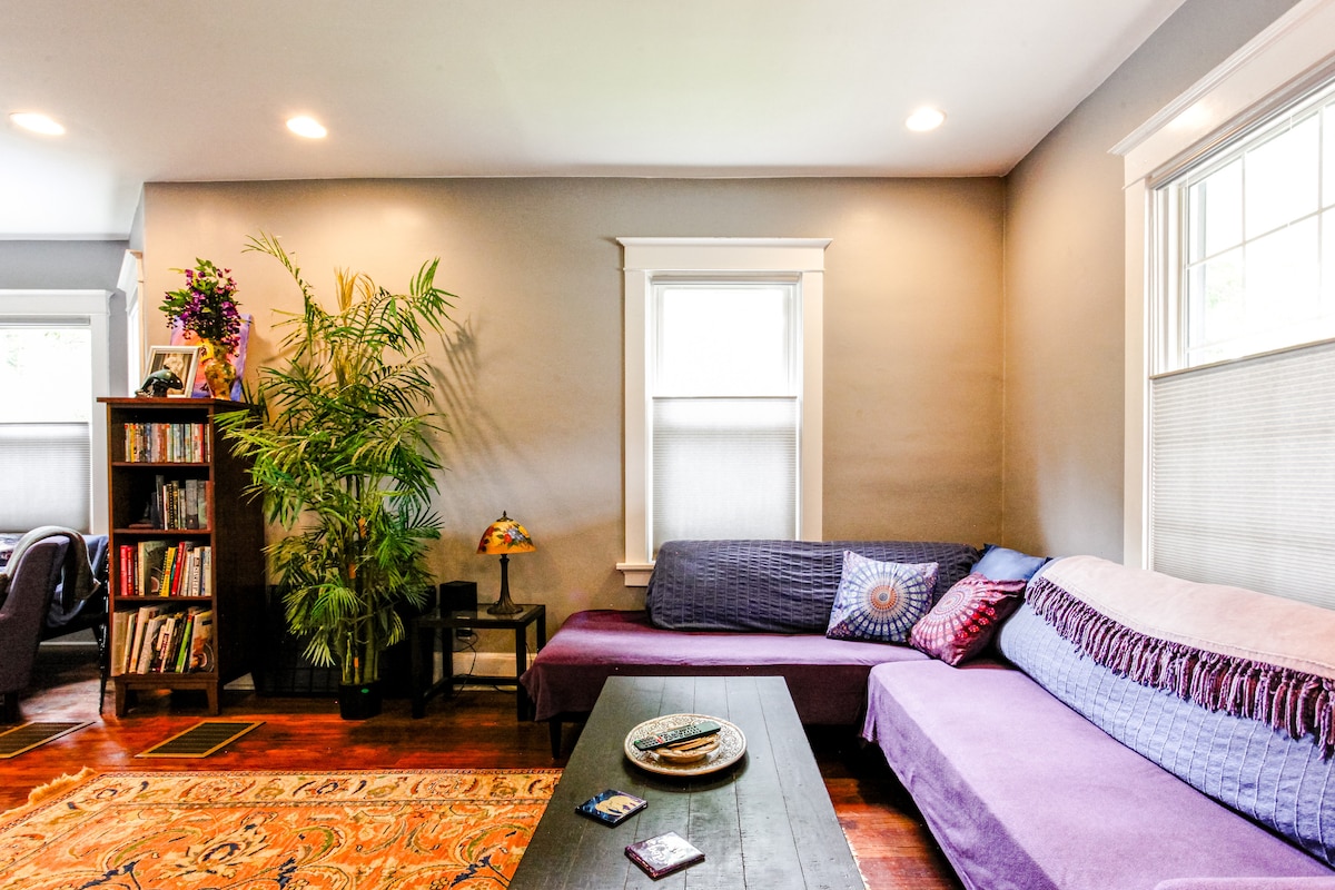 ¡Disfruta de una estancia acogedora en un refugio boho de mediados de siglo! Ubicado en Pleasant Ridge, este es un apartamento de eficiencia de un dormitorio con baño completo (ducha, sin bañera), bar, mini nevera y microondas, tostadora/horno/freidora de aire. Una cama queen y un huésped adicional pueden dormir en el sofá plegable. El espacio tiene una entrada privada y estacionamiento gratuito en una calle tranquila. Se admiten mascotas y jardín vallado. A tres minutos a pie del parque, a 7 minutos a pie del distrito de entretenimiento local.