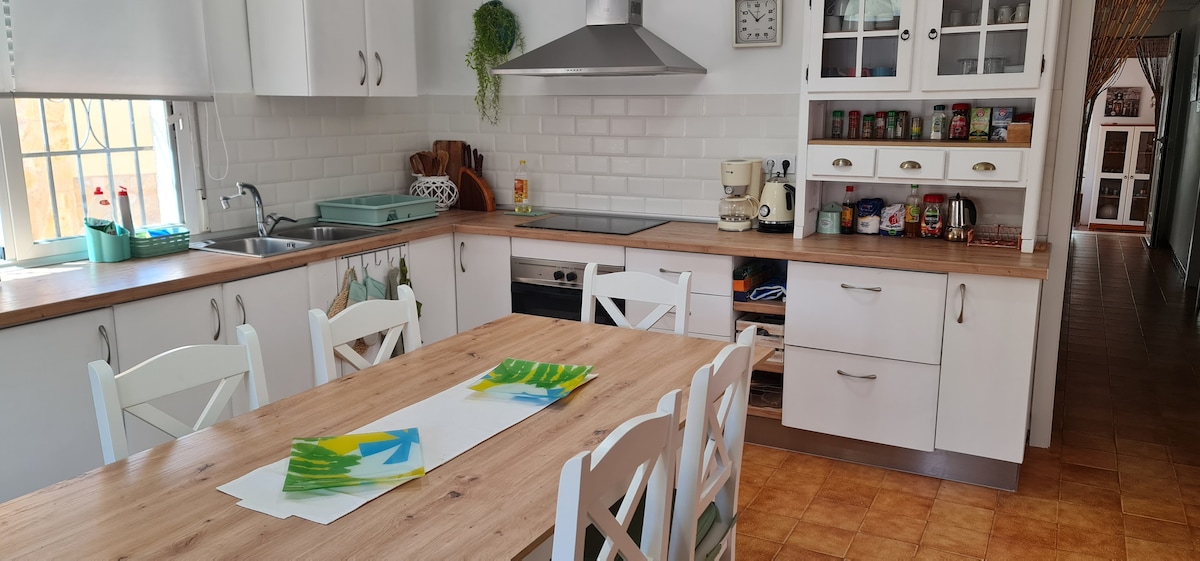 Casa Esther. Tres habitaciones dobles cada una. dos lavabos. Porche delantero y trasero. barbacoa. Aire acondicionado en todas las habitaciones. Campo de almendros. El centro de la ciudad a diez minutos andando. A 300 metros playa Romana. Segunda línea, muy tranquila y con poco tráfico. Mi alojamiento es bueno para familias (con hijos). parquing privado. tranquilidad y playa.