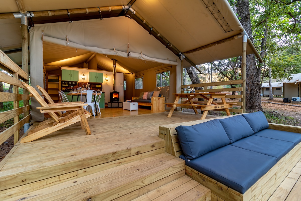 Situado en una posición única a lo largo del arroyo con una vista impresionante de los acantilados impresionantes. La lujosa tienda de campaña independiente está diseñada para proporcionar una vida elegante con comodidades y comodidades modernas dentro de la naturaleza. Las tiendas de campaña en la terraza tienen capacidad para dos personas adultas, con un amplio salón, comedor y cocina, un dormitorio y un baño de planta abierta con bañera, lavabo, ducha e inodoro cerrado. También se puede proporcionar una cuna o una cama de camping en las tiendas de campaña para niños.