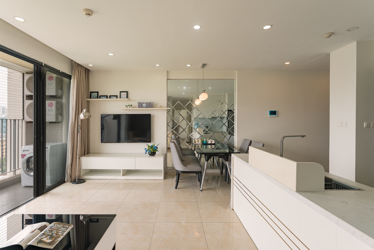 Hermoso ● apartamento ubicado en el EDIFICIO C7 - VINHOMES D'CAPITALE famoso por su buen servicio, lujo y departamento de alta calidad. DEPARTAMENTO de 2 ● dormitorios, 2 baños, 1 bañera moderna, 1 sala de estar espaciosa a estrenar y amueblada, con balcón soleado. Vista al lago y a la ciudad. ● Dormitorio con cama grande y ropa de cama suave, aire acondicionado de 2 vías para ofrecerte un sueño bueno y profundo. ● Televisión inteligente con WiFi, NETFLIX. ● Refrigerador, lavadora.