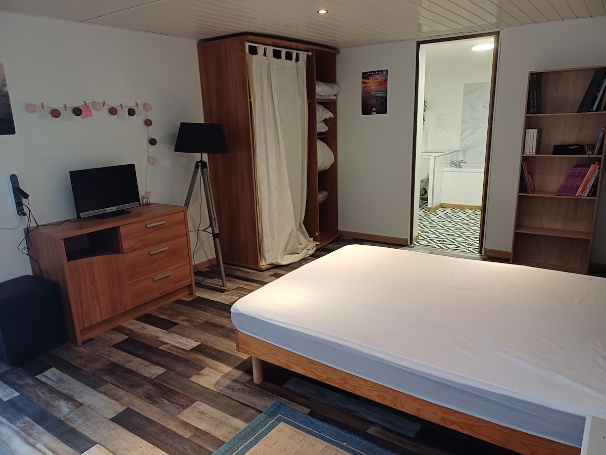 Tranquila habitación «Studio» en una urbanización en Thaon, entre Caen y el mar. Alojamiento con acceso independiente de la casa, baño privado, aseo y pequeña cocina americana para una estancia tranquila al lado de las playas del DÍA D Ropa de cama BZ con colchón Simmons 160*200 y 15 cm de grosor para una estancia con una mayor comodidad. Cocina con elementos básicos (cafetera, hervidor de agua, placa de inducción, microondas...) Vivo en el alojamiento de al lado y estoy disponible cuando sea necesario