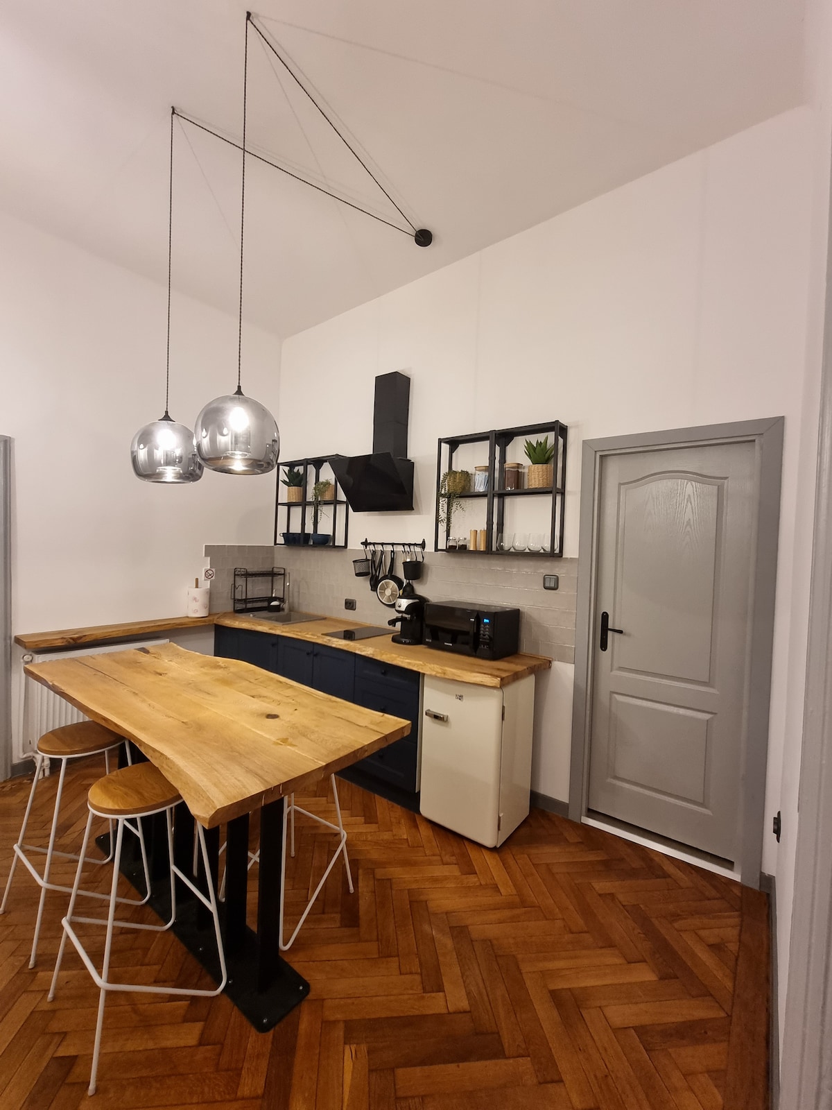 Siente la elegancia del Viejo Mundo en habitaciones con techos altos, suelos de parqué y características arquitectónicas de época. Las paredes negras y el arte abstracto añaden un toque moderno, mientras que otros detalles evocan el Art Deco. Sal al estrecho balcón para tomar un poco de aire fresco. El apartamento está a un minuto a pie de la famosa Piata Sfatului y del centro del casco antiguo. Camina un poco más lejos para ver la arquitectura gótica de la Iglesia Negra.