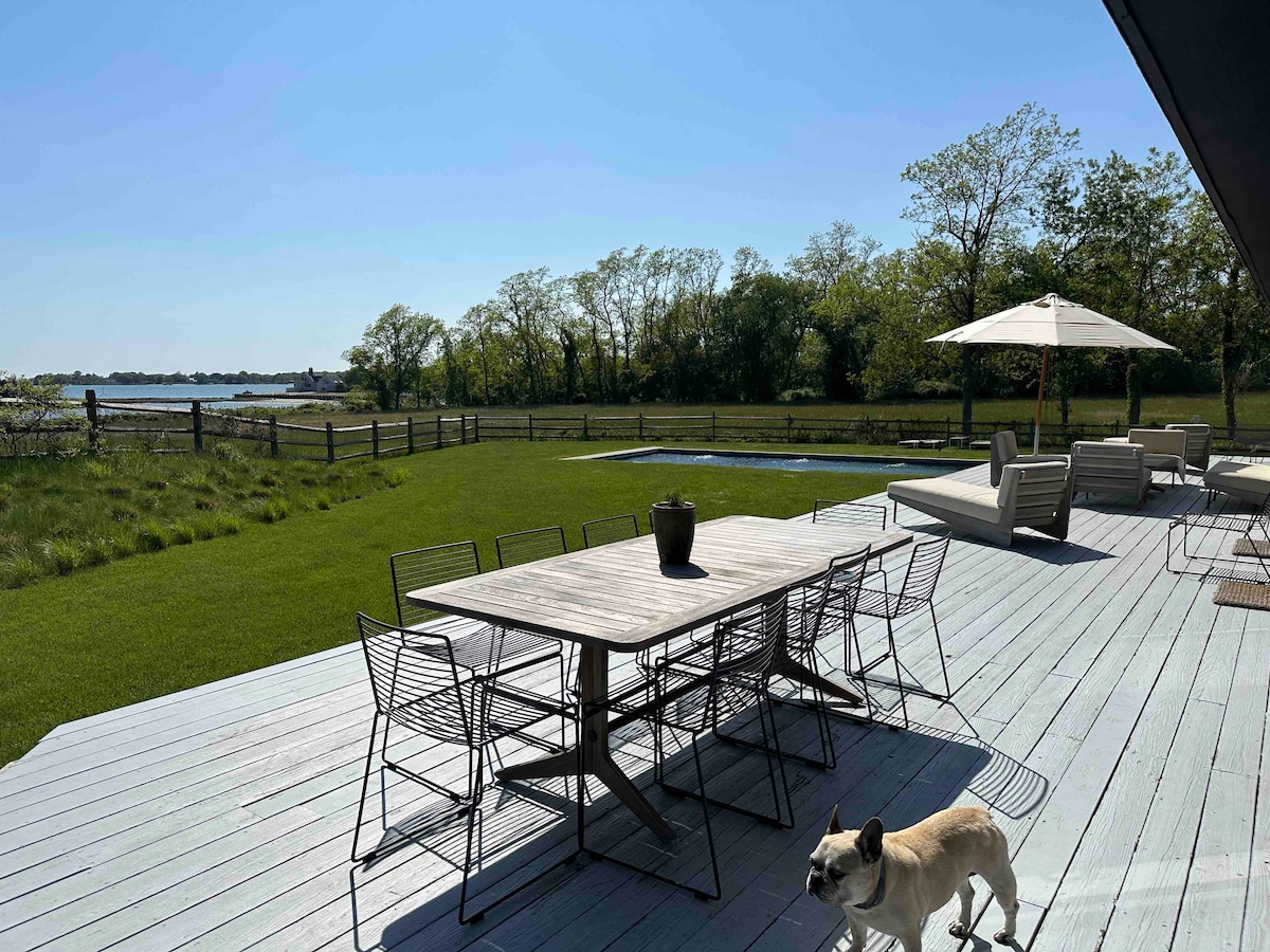Retiro de lujo frente al mar en Sag Harbor. Como se muestra en Mansion Global y Homeworthy. Esta serena casa de diseño ofrece acceso directo a la bahía para practicar kayak y surf de remo, además de un camino privado a la isla Clam para paseos tranquilos y picnics en la playa. Disfruta de una cocina gourmet con electrodomésticos Viking y Sub-Zero, baños en suite tipo spa y ropa de cama lujosa. A minutos de las playas de la bahía y del pueblo de Sag Harbor, tu escapada privada te espera. Ideal para escapadas románticas, semanas de relajación o un descanso de verano.
