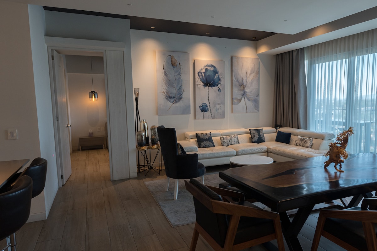 Lujoso departamento en Guadalajara, decorado por el despacho FNisino y con muebles fabricados a la medida por manos tapatías. Hospédate en uno de los edificios más exclusivos y nuevos de Providencia, cerca de la zona financiera, el Bosque Colomos, Punto Sao Paulo y solo a 10 minutos de Andares. Espacio excepcionalmente cómodo, que cuenta con todos los servicios y que te hará pasar una increíble estancia. Cuenta con seguridad 24/7, alberca, gimnasio, coworking y estacionamiento propio.