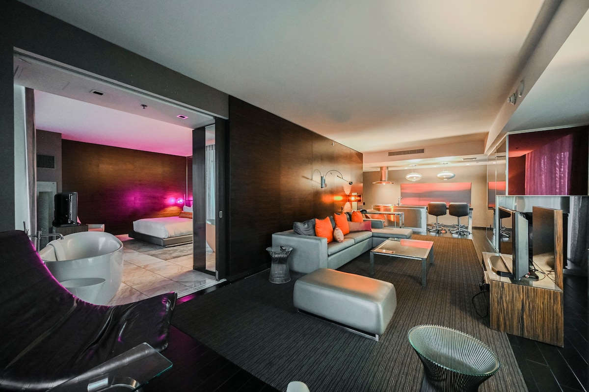 Disfruta de una suite única en Las Vegas... Impresionante diseño y decoración con muebles de lujo con un toque de mediados de siglo. El plano de planta de concepto abierto tiene 2 dormitorios/2 baños y una amplia superficie de 2100 pies cuadrados. Disfruta de entretenimiento las 24 horas en la mesa de billar de acero inoxidable y el juego de cócteles de varios lados (los mejores juegos clásicos de los 80/90). La sala de estar tiene un gran sofá seccional, televisores LG de 65 pulgadas e iluminación LED en todas partes. La terraza envolvente tiene vistas a la piscina interior/exterior y al Strip de Las Vegas.