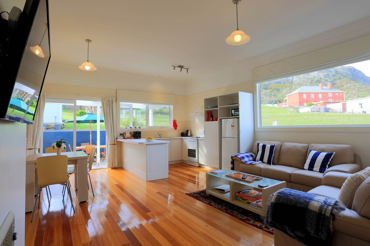 Ivys by the beach . Modern well appointed, clean and cosy, WIFI. This one bedroom home offers a comfy Queen bed plus a sofa bed in the lounge area for extra quests. Full cooking facilities, sofa bed and a short walk to historic town centre and restaurants. The convenience of washer and dryer, plus excellent heating and cooling. Relax on the deck overlooking lush farmland and with views across to Highfield. From the front door you can view The Nut and a short walk to the beaches .