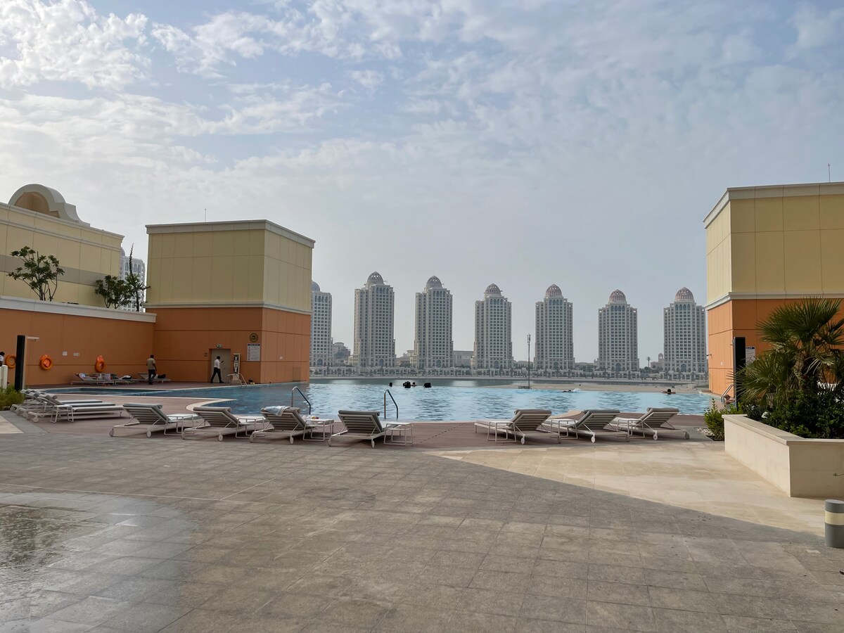 Despierta con brillantes vistas al puerto deportivo en este espacioso apartamento 1BR en Porto Arabia, The Pearl-Qatar. Disfruta de un balcón privado, cama tamaño king, 1,5 baños, cocina completa, armarios empotrados y una amplia sala de estar con un televisor inteligente de 65 pulgadas. Ideal para parejas, huéspedes solitarios o viajeros de negocios. Supermercado SPAR en la planta baja, además de cafeterías y tiendas cercanas. Incluye wifi rápido, estacionamiento, lavadora, sábanas limpias y seguridad las 24 horas. Tranquila, elegante y a unos pasos del agua, ¡tu escapada perfecta a Qatar!