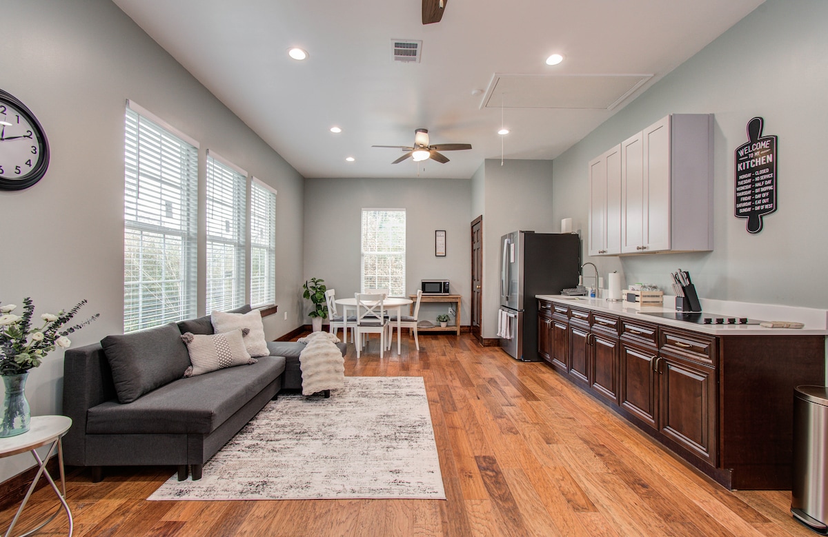 Moderno apartamento independiente con garaje totalmente renovado en un estudio privado con su propia entrada. Ubicado en el centro de Houston, perfecto para parejas o viajeros solos. Disfruta de tu jacuzzi privado después de un día explorando la ciudad. Cuenta con una cómoda cama tamaño king, cocina totalmente equipada, televisor inteligente y wifi rápido. Espacio elegante, acogedor y tranquilo diseñado para la relajación y la comodidad. Perfecto para escapadas románticas o estancias de negocios.
