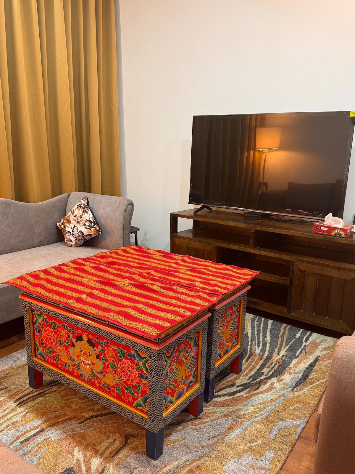 A cozy three-bedroom apartment with a scenic view of the entire Paro town, and a breathtaking view of the Dzong (Fort), and museum. This apartment which has 3 bedrooms is ideal for families and friends who want to spend time together, but also have separate space as well. It is located in a quiet and safe neighbourhood. The kitchen is equipped for light cooking and it also comes with a refrigerator and a washing machine. The apartment accommodates 5 guests.