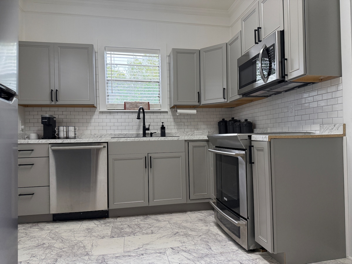 Super cute and cozy cottage centrally located in beautiful Thomasville! Close to downtown and from so many great places to eat and shop! Beautifully decorated and fully equipped with all of the comforts and conveniences of home. Thick comfortable king bed in master and queen in bedroom #2 and Smart big screen TVs in both bedrooms! A large 65” Smart TV in the relaxed living room area. Fast WiFi everywhere! The kitchen is HUGE and is fully stocked! Awesome porch with swing and Weber Gas Grill!