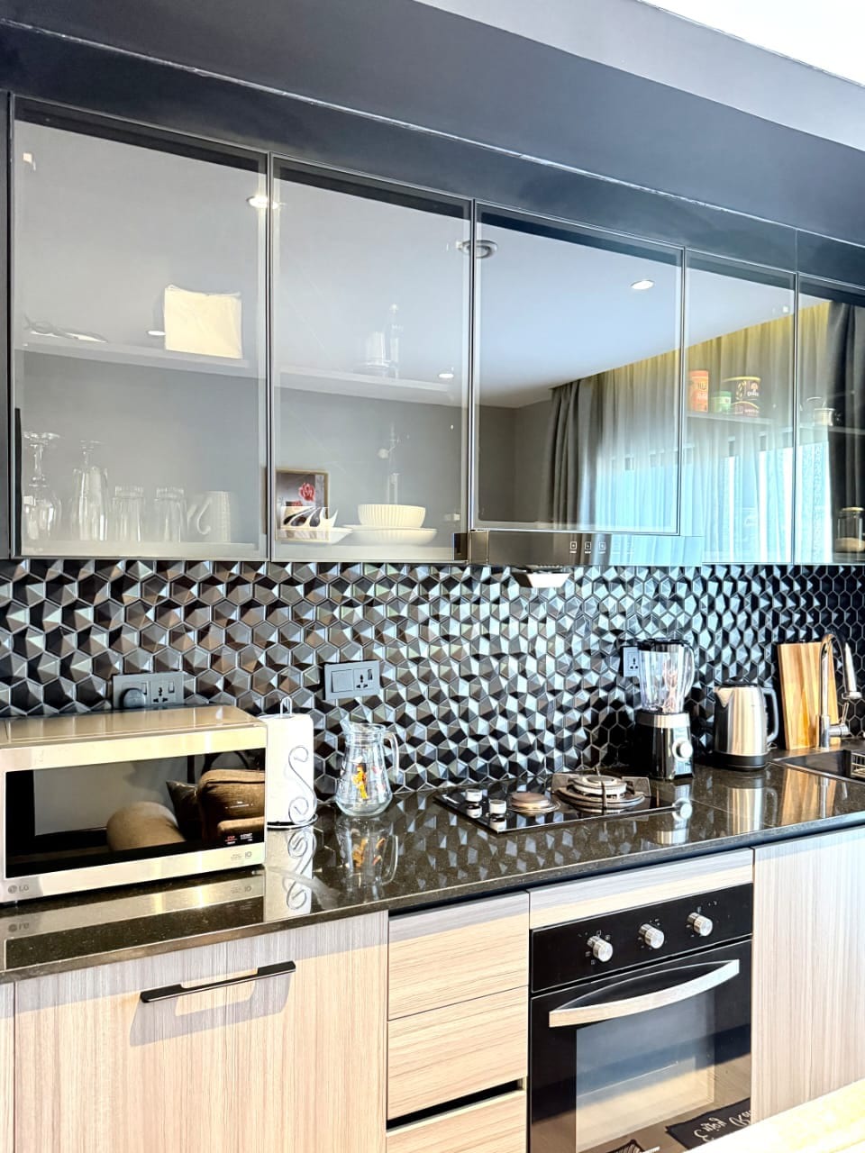 Opting for clean and uncluttered energy, you’ll find this apartment unit equipped for the most discerning guests. The living space displays minimalism with a tone style to complement contemporary decor with a hint of Japanese Wabi Sabi style. Colors are serene and neutral and comfort is the standard. Wall-to-wall glass facade windows flood the space with natural light (and warmth). Looking to take a siesta? Note : Gym and Pool is paid for guests that stay +30 days