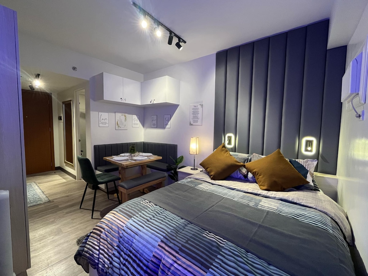 Unidad en el piso 18 con impresionantes vistas a la ciudad: • Cama🛏️ tamaño queen + cama plegable adicional (bajo solicitud). • Televisor inteligente de 📺 55 pulgadas, aire acondicionado, wifi de alta velocidad. • 🍳 Cocina con microondas, cocina de inducción, hervidor, arrocera. • Calentador🚿 de regadera • 🏊 Acceso a la piscina y al gimnasio. • 🅿️ Estacionamiento de pago y estacionamiento gratuito hasta las 10:00 p. m. • 📍 Cerca de Ayala, centros comerciales SM, tiendas de comestibles, cafés, spas. • 👌 Ideal para parejas, viajeros y estancias de negocios.