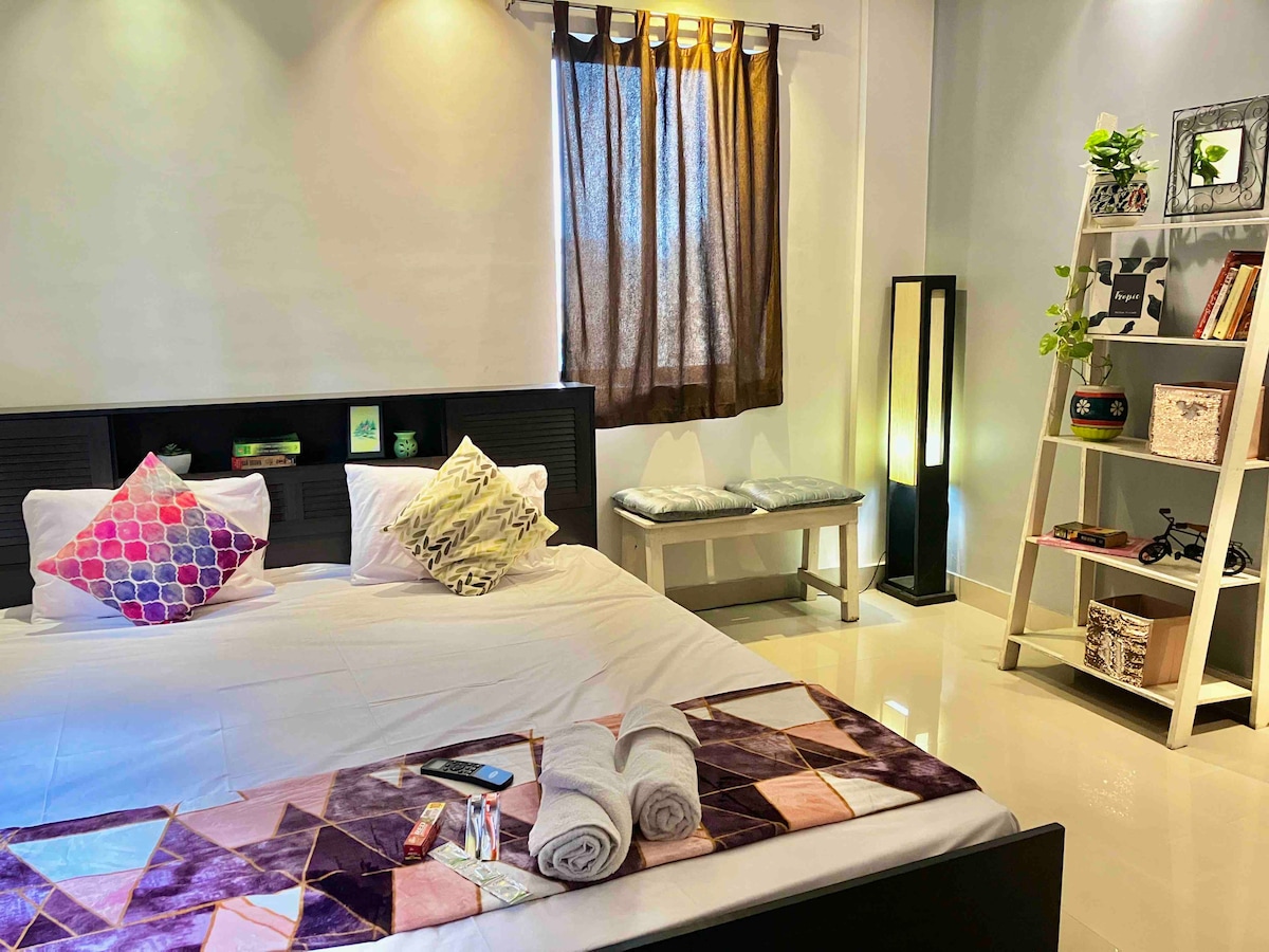 ¡Acogedor 1BHK en la planta baja con un ambiente de cine en casa! Disfruta de un enorme proyector para noches de cine, una cocina totalmente equipada con nevera, microondas, purificador de agua y todos los elementos esenciales. El dormitorio cuenta con una cómoda cama tamaño king, aire acondicionado y amplio espacio de almacenamiento. Incluye lavadora, baño limpio con artículos básicos, wifi y llegada autónoma para tu comodidad. Apto para mascotas y perfecto para parejas, viajeros solitarios o estancias largas. Unidad privada sin espacios compartidos. No se aceptan pruebas de identidad locales.