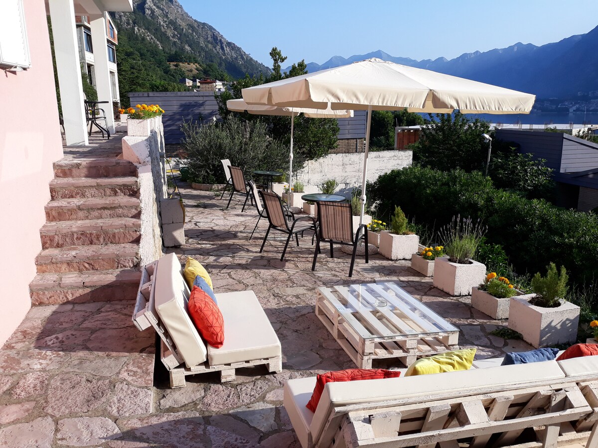 Beautiful apartment with great view on Boka Bay and Kotor. Apartment is modern furnished, has terrace ideal for relaxed stay with great location. Beach is on 50m from object. We are situated on 1.4 km away from Old town;going to Prcanj.Hospital,police and post are 300m away.Banks are in the Old town.Nearest supermarket is 300m away. Airports are on distance of:Tivat-7km,Podgorica-90km ,Cilipi(Croatia)-70km. Welcome , Kotor is living history in a spectacular bay