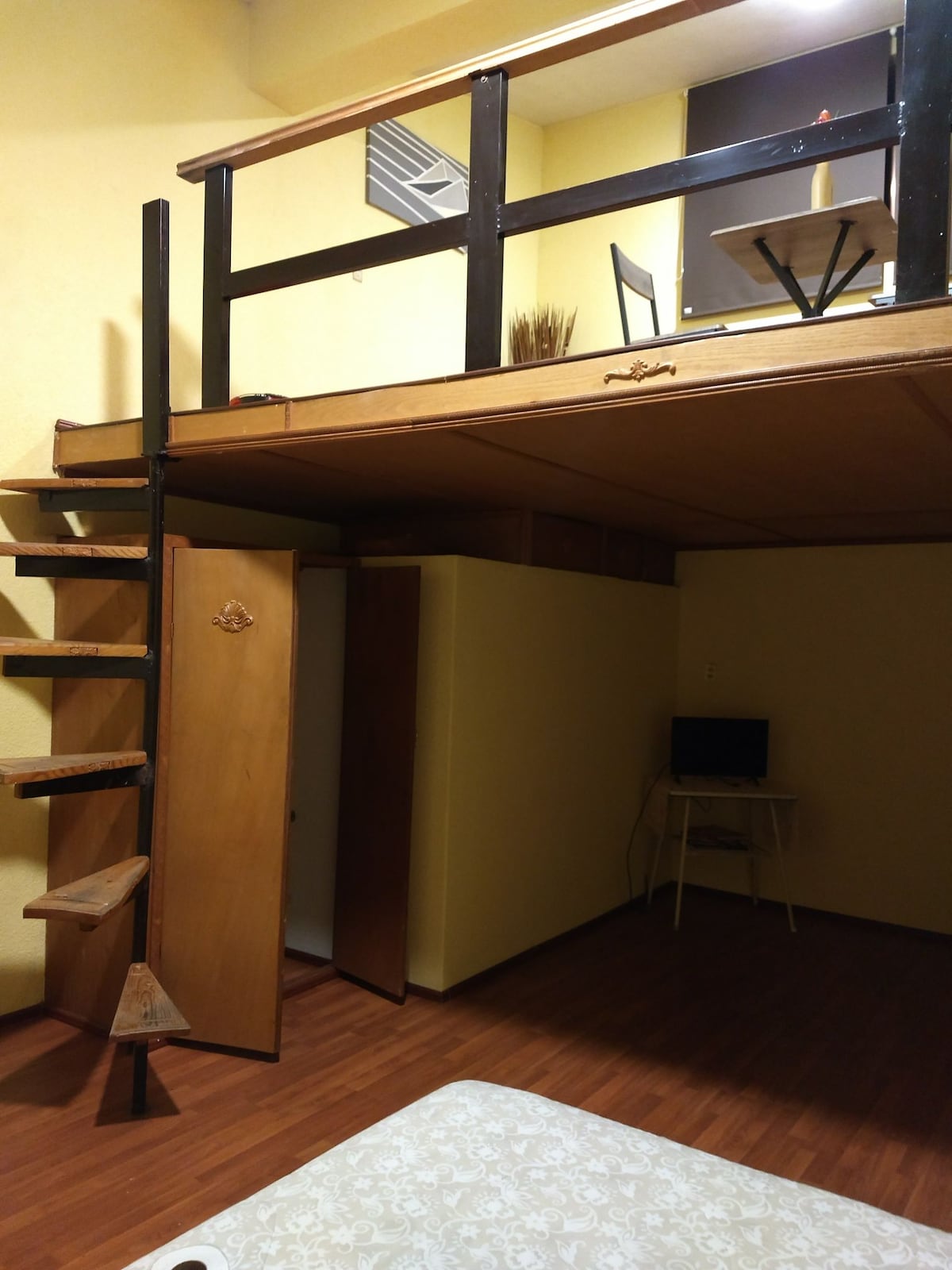 Dormitorio pequeño, terraza con vistas fantásticas, escaleras para subir
