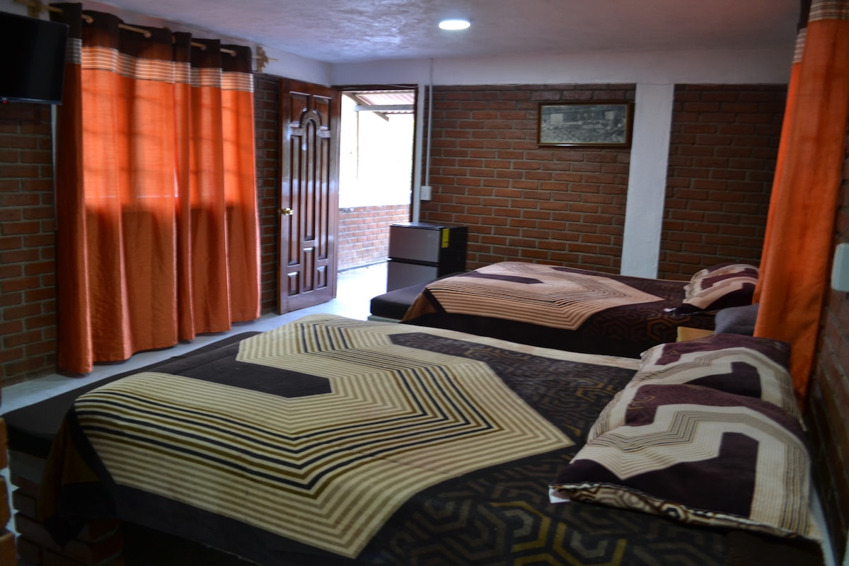 es un espacio totalmente nuevo, cuenta con una vista muy bonita al pueblo de tlalpujahua y cuenta smart tv, frigobar, horno de microondas, cafetera, 3 camas matrimoniales y colchones lunna.