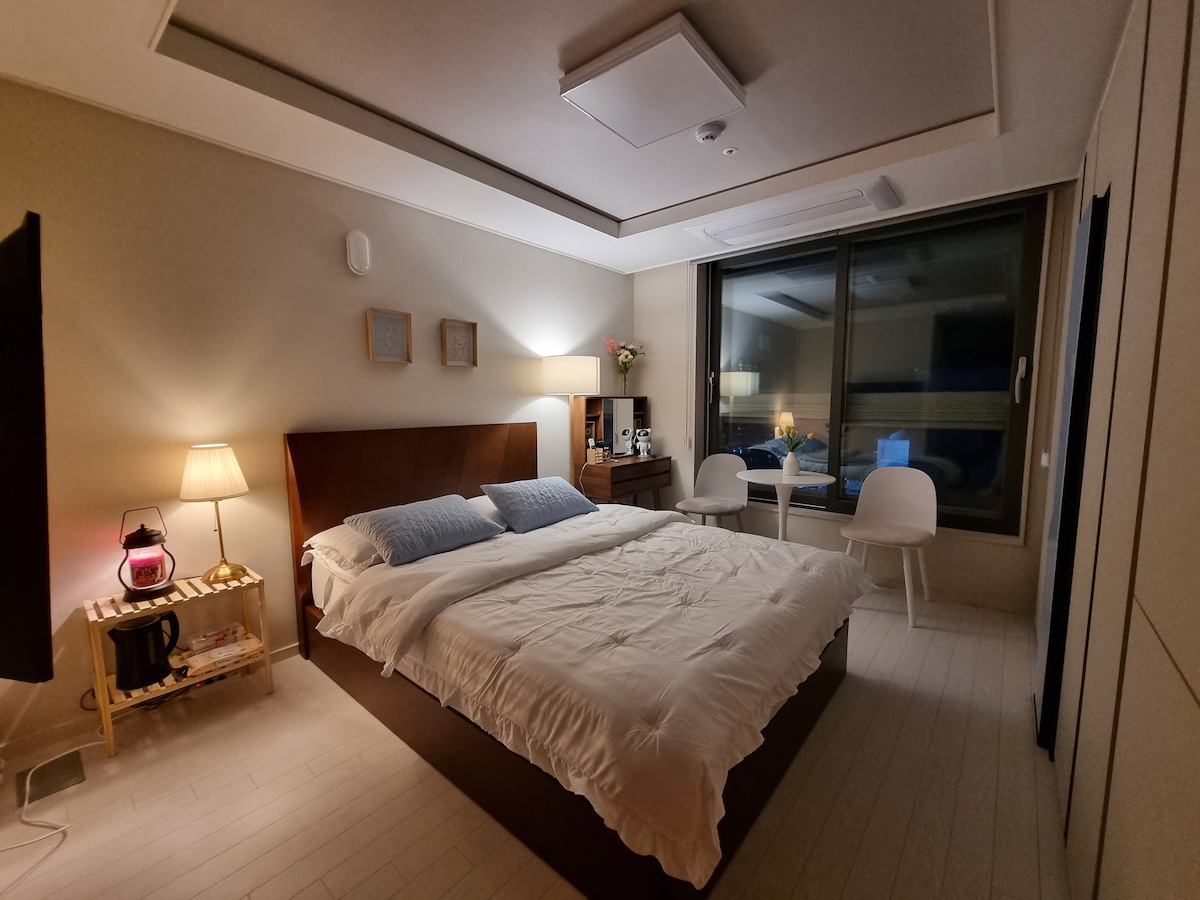 Está a 1 minuto a pie del metro y de la calle Jungang Rone en la zona de la superestación de Dongseong-ro, por lo que el transporte es conveniente. Está cerca de Daegu Modern Alley, Pharmacy Alley, Kim Gwangseok Street y Daegu Sparkland, que es un curso turístico en el centro de la ciudad de Daegu, y hay varias instalaciones de infraestructura para disfrutar, como cines, centros comerciales, ocio y restaurantes cercanos. Es un edificio nuevo y limpio con un proyector de haz, reproductor de LP, (LP moderno y LP emocional retro), estilizador, sistema de aire acondicionado, lavadora, inducción, refrigerador, sofá, televisor inteligente (Netflix, YouTube), wifi gratuito, plancha, tabla de planchar, etc. Puedes descansar cómodamente. También hay disponible una cálida máquina de café y café en cápsulas Starbucks Americano. Para los vehículos, debes usar el estacionamiento de pago. Te guiaremos al estacionamiento cercano.