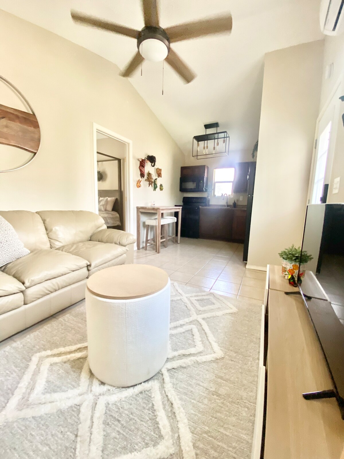 Acogedor y bien decorado apartamento de un dormitorio con cama tamaño king y sofá cama. Cerca de hospitales, UTEP, el estadio de béisbol de Chihuahua y el distrito de entretenimiento del centro de la ciudad. A 4 cuadras de la I-10. A 4 cuadras del nuevo sistema de tranvías y paradas de autobús. Zona residencial más antigua tranquila y segura en el corazón de la ciudad. Internet, TV inteligente, cocina con estufa, microondas, cafetera y nevera. La unidad está equipada con refrigeración por evaporación más una unidad de aire acondicionado refrigerada adicional en el dormitorio.