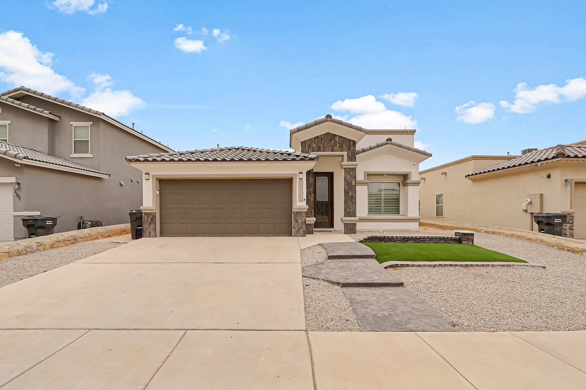 Retiro de lujo moderno con jacuzzi • Enorme patio cubierto • Cocina de diseño • Chimenea • Oasis de patio privado ⭐ Perfecto para familias • viajeros de negocios • escapadas de fin de semana • estadías de larga duración Bienvenido a tu elegante escapada a El Paso, un alojamiento moderno bellamente renovado diseñado para la comodidad, la relajación y estancias inolvidables. Desde la cocina del chef de alta gama hasta el patio trasero de estilo resort con jacuzzi, cada detalle de esta propiedad está diseñado para brindar a los huéspedes una experiencia de lujo.