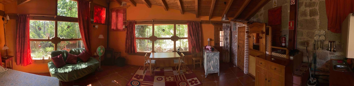 Naturaleza, calma y tiempo de calidad, a un paso de Madrid. Cabaña de piedra y madera con amplios ventanales al prado y vistas a la montaña. Entorno ideal para parejas, amigos, familias o para estar solo: río con cascada, bosques de robles y rutas de montaña fáciles para explorar juntos. Cocina equipada, baño y ducha independientes. Piscina portátil en verano y barbacoa de gas. Jardín para relajarse al aire libre. Hay gatos en la zona, se admiten perros tranquilos que no molesten a los gatos.