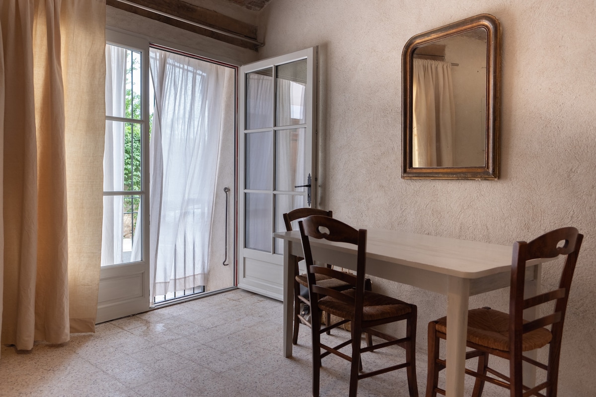 Appart typiquement provençal avec le charme des tommettes et de son plafond restaurée au gout du jour. Il offre une grande pièce a vivre avec cuisine équipée. Il peut accueillir 5 pers : Une chambre avec salle de bain composé d'une baignoire ainsi qu'une mezzanine offrant 2 couchages sécurisés avec originalité pour le plaisir des enfants. Il est situé dans le centre du village, proche toute commodité. Cet appart vous offrira un voyage en Provence, avec cette vue dégagé et lumineuse