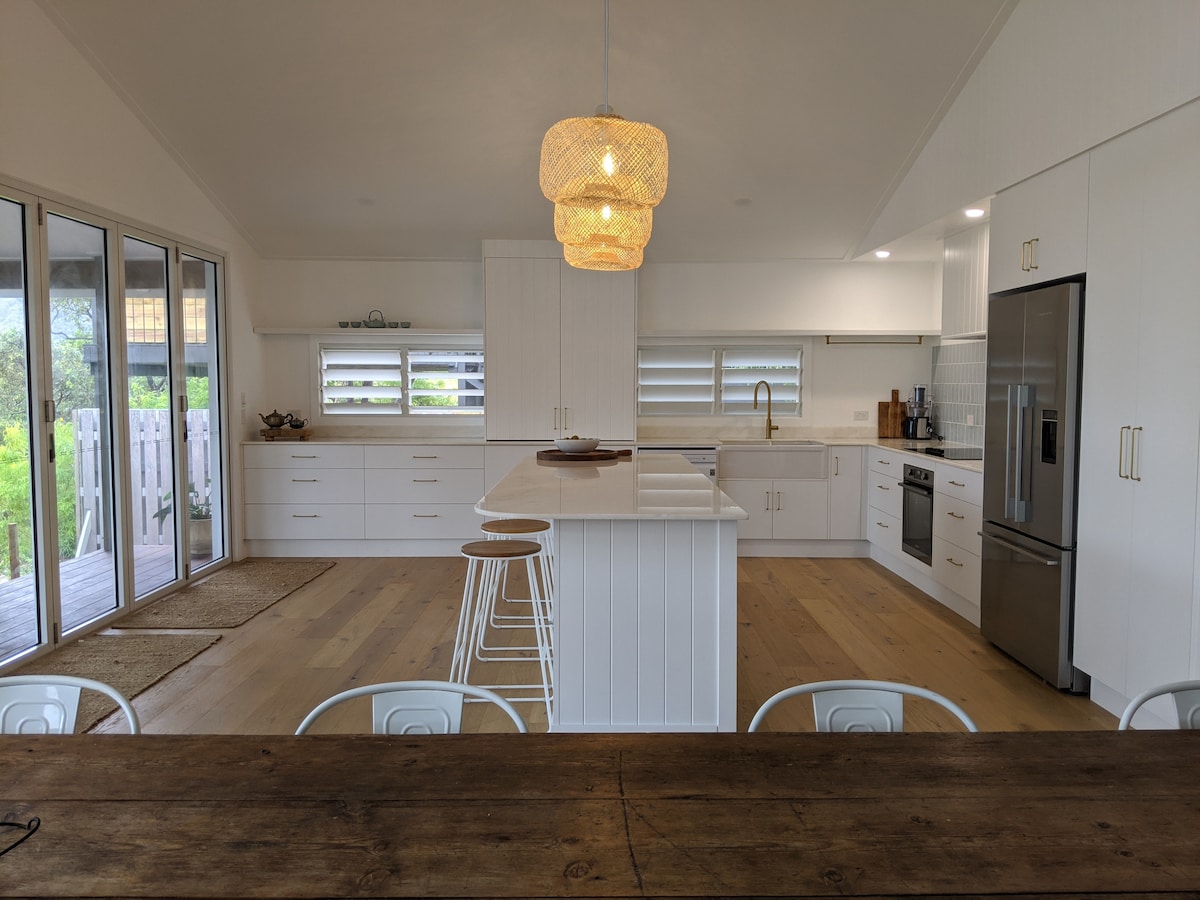 Casa de isla de nueva construcción en Queensland. Vistas al mar, brisa ligera y acceso directo a la playa a lo largo de un camino privado. Césped llano, chimenea y árboles autóctonos. Puede que incluso veas un koala. Vida interior/exterior en todo su esplendor. Una enorme cocina de planta abierta, comedor y sala de estar que fluye hacia la terraza, barbacoa, máquina de hielo y nevera bar. Televisor grande con Chromecast e internet de alta velocidad con datos ilimitados. Zonificado individualmente, nuevo aire acondicionado en cada habitación. Se admiten fiestas por un módico precio. Entrada desde el aparcamiento a 15 pasos.